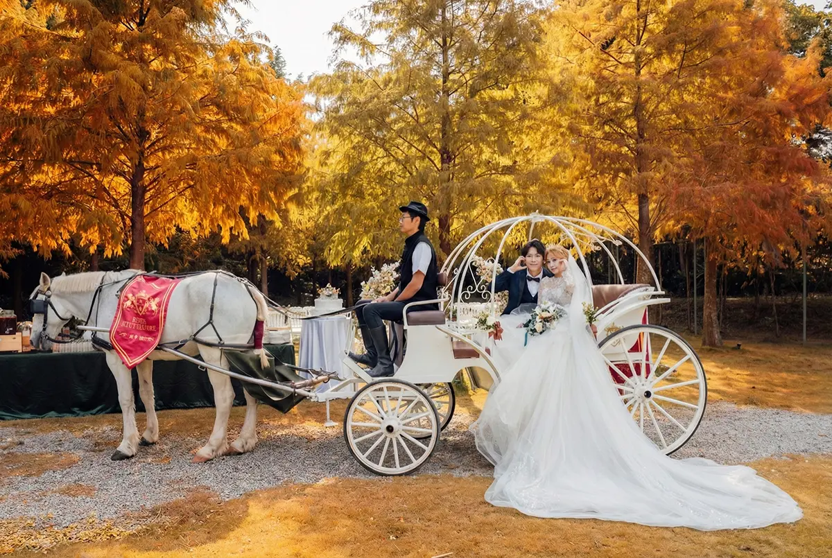 其中最受海外新人青睞的主題之一為「南瓜馬車婚禮」,該方案以白色南瓜馬車象徵幸福啟程,新人彷彿化身童話故事中的王子與公主,在綠意環繞的森林場景中完成終身大事,兼具浪漫氛圍與獨特記憶點,成為許多新人心中的夢幻婚禮。