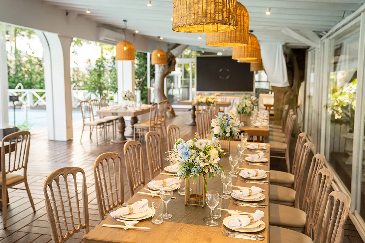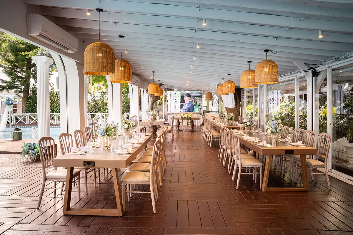 面向閃閃發光的泳池,「法頌廳」的每一角落都能捕捉到水面上的光影變化,無論是日光下的閃耀還是夜晚燈光的映照,都將為您的活動增添一份獨特的魅力。此外,場地配備了先進的冷暖氣系統,確保在任何天氣條件下都能為賓客提供最舒適的體驗。