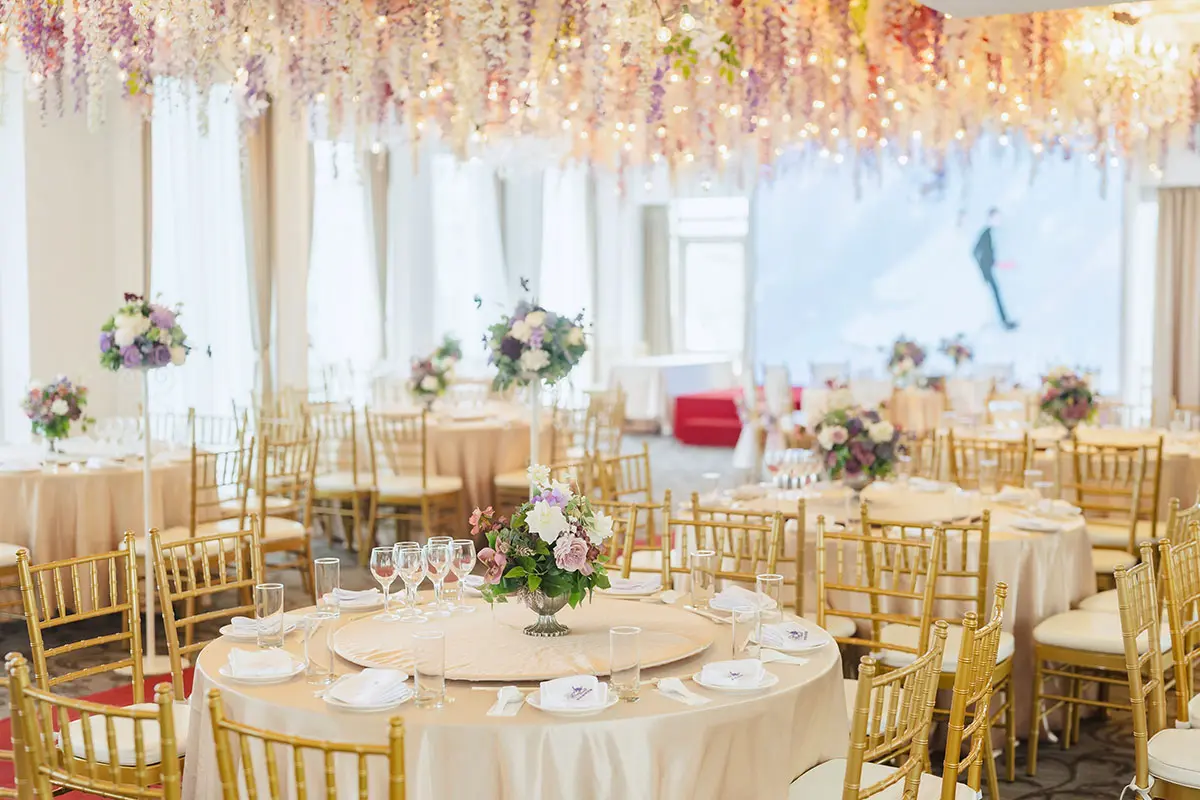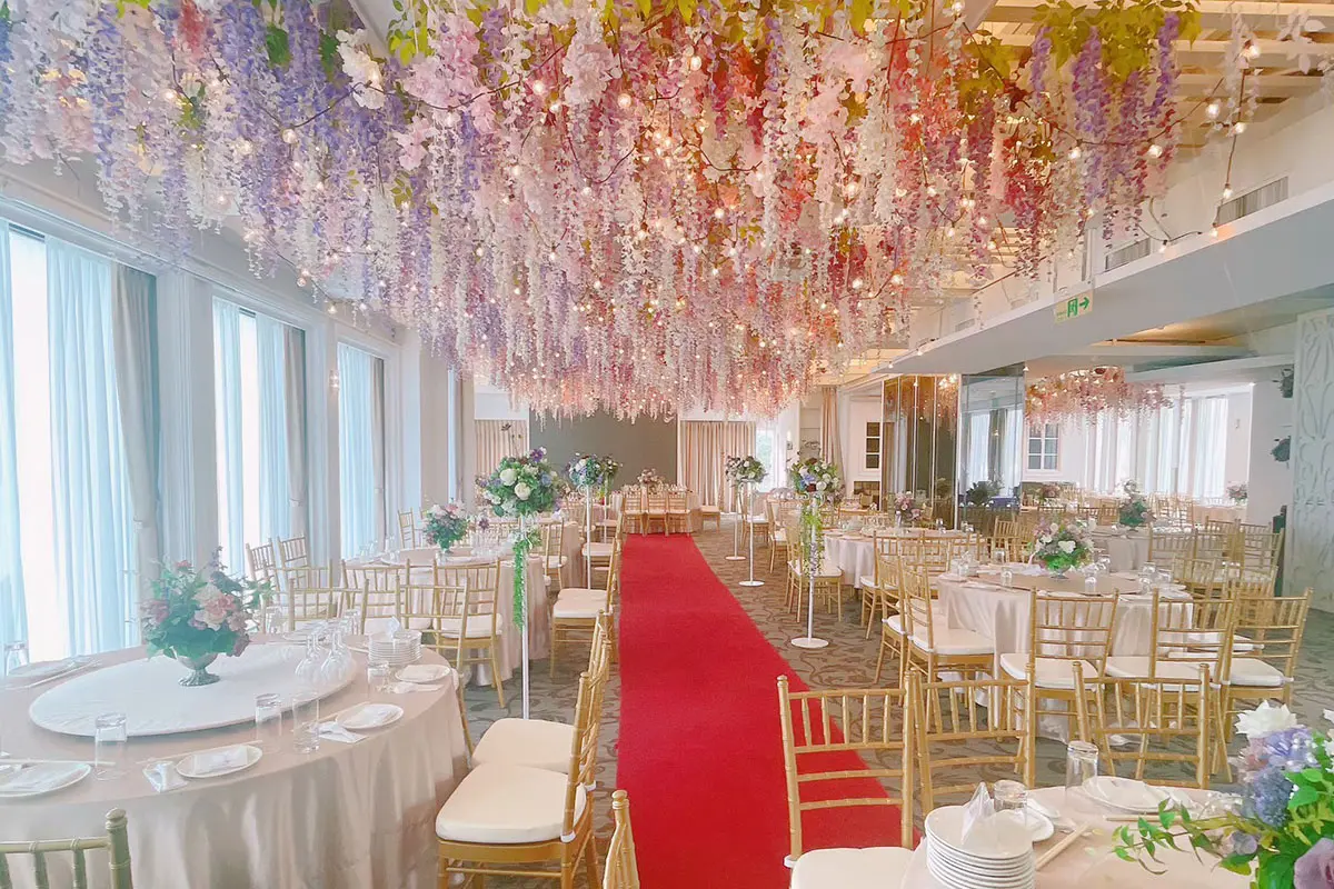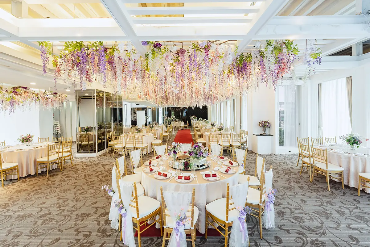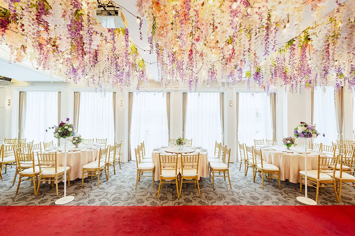 巴洛克廳內,彩繪玻璃與繽紛花海交織出一場視覺的盛宴。天花板上的花串如同精靈般低垂,搭配柔和的光線,營造出如夢似幻的氛圍。金色的椅背閃耀著溫暖的光澤,與米色的桌布相映成趣,呈現出經典而高雅的風格。