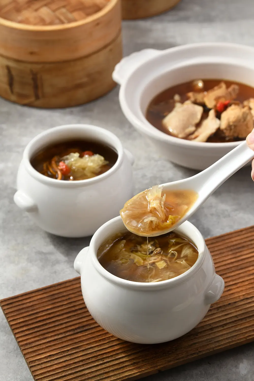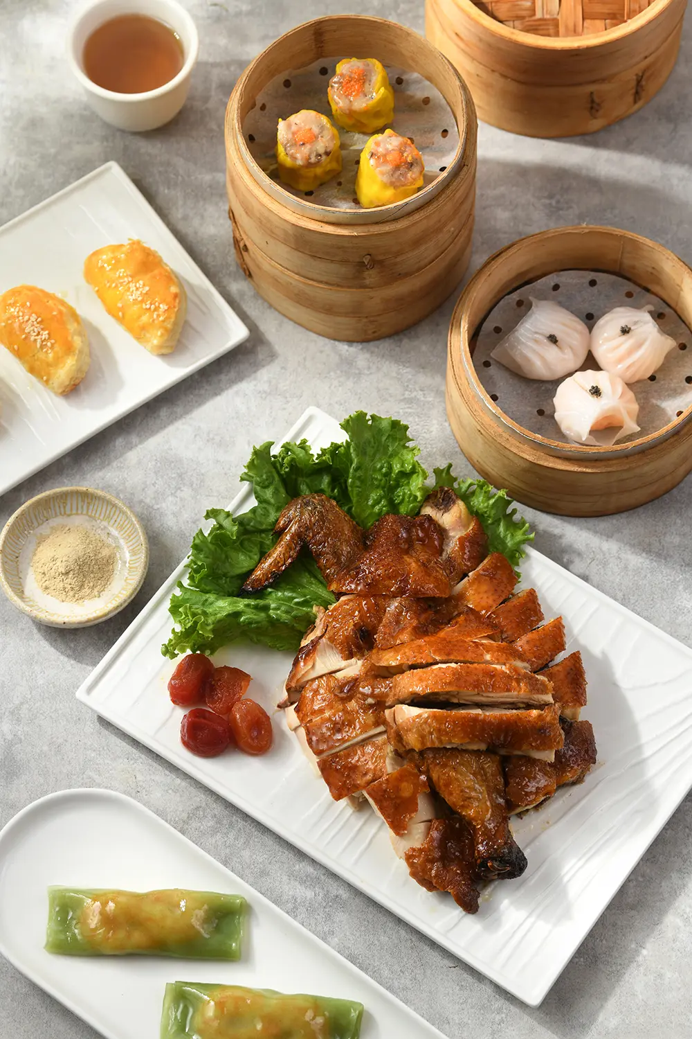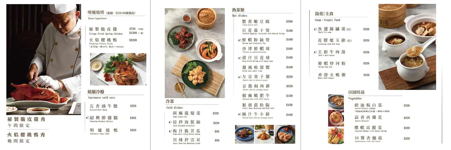 其中包含了經典的「臘味蘿蔔糕」、深受饕客喜愛的「魚翅錦繡羹」、「明爐燒鴨」與酒香十足的「紹興醉雞」,再加上粵菜中「麻辣水煮魚」與「左宗棠子雞」等必吃美食,讓顧客能夠體驗豐富的味覺盛宴。