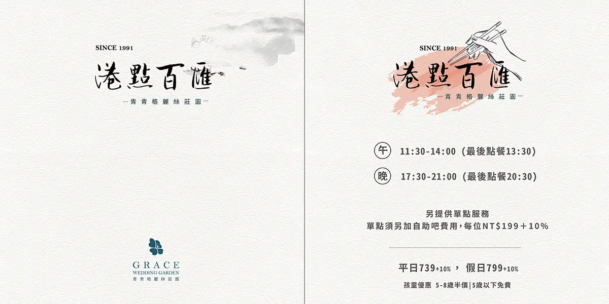 用餐價位 平日/週一~週五 $739+10%/人 假日/週六日與國定假日 $799+10%/人 孩童優惠:5歲以下免費;5歲-8歲 半價 用餐時段: 午餐11:30-14:00 (供餐至13:30) 晚餐17:30-21:00 (供餐至20:30)