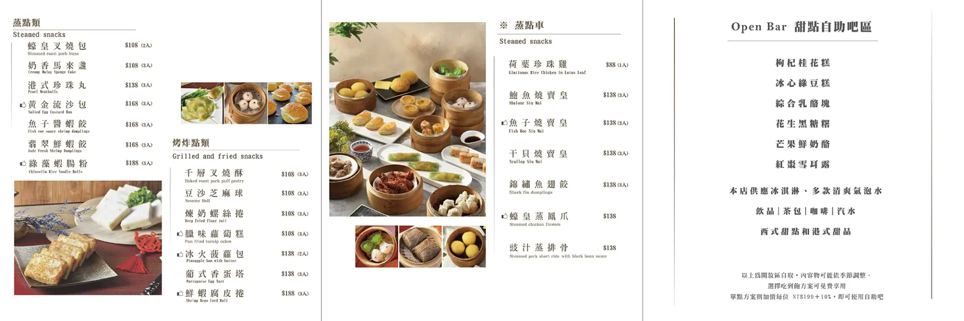 而在最新的菜單中,一共提供了10種不同品類的豐富選擇。從傳統的「蒸點車」到現代創新的「Open Bar」,每一種選擇都能滿足不同顧客的需求。另外還有「烤炸商品」、「燉湯」、「熱菜」等各式的種類。