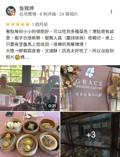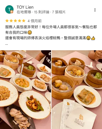 - 格麗絲是個很浪漫的婚禮場地,環境舒適,港式飲茶的菜色都很好吃超棒,很適合大人小孩來吃~我很推薦大家來青青格麗絲用餐哦!