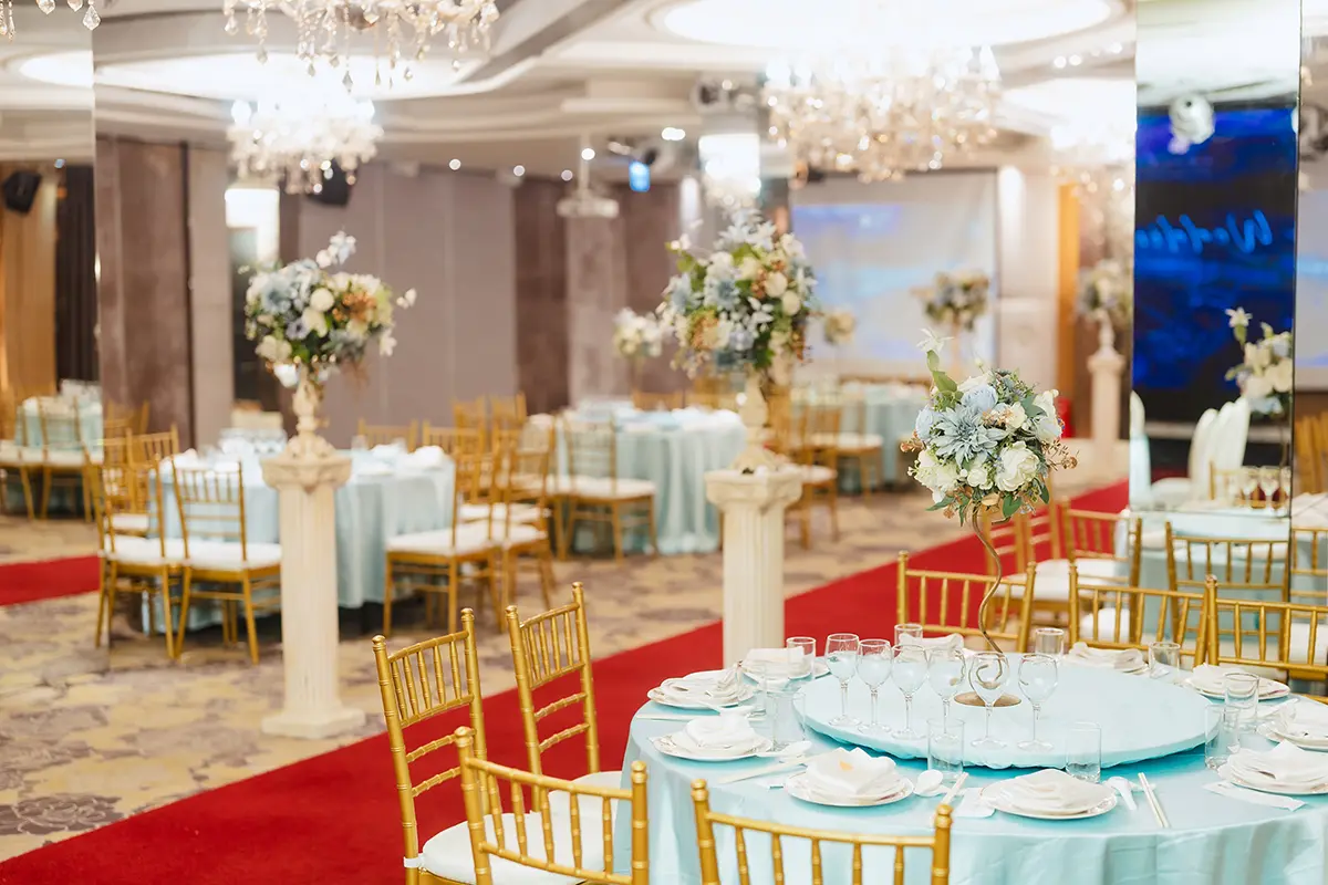 愛麗絲廳,一個從青青格麗絲莊園綻放出的童話世界,這裡的每一個細節都彷彿是從愛麗絲夢遊仙境中翻頁而出。柔美的白色椅套與天空藍的飾帶相映成趣,營造出一片清新脫俗的童話空間。