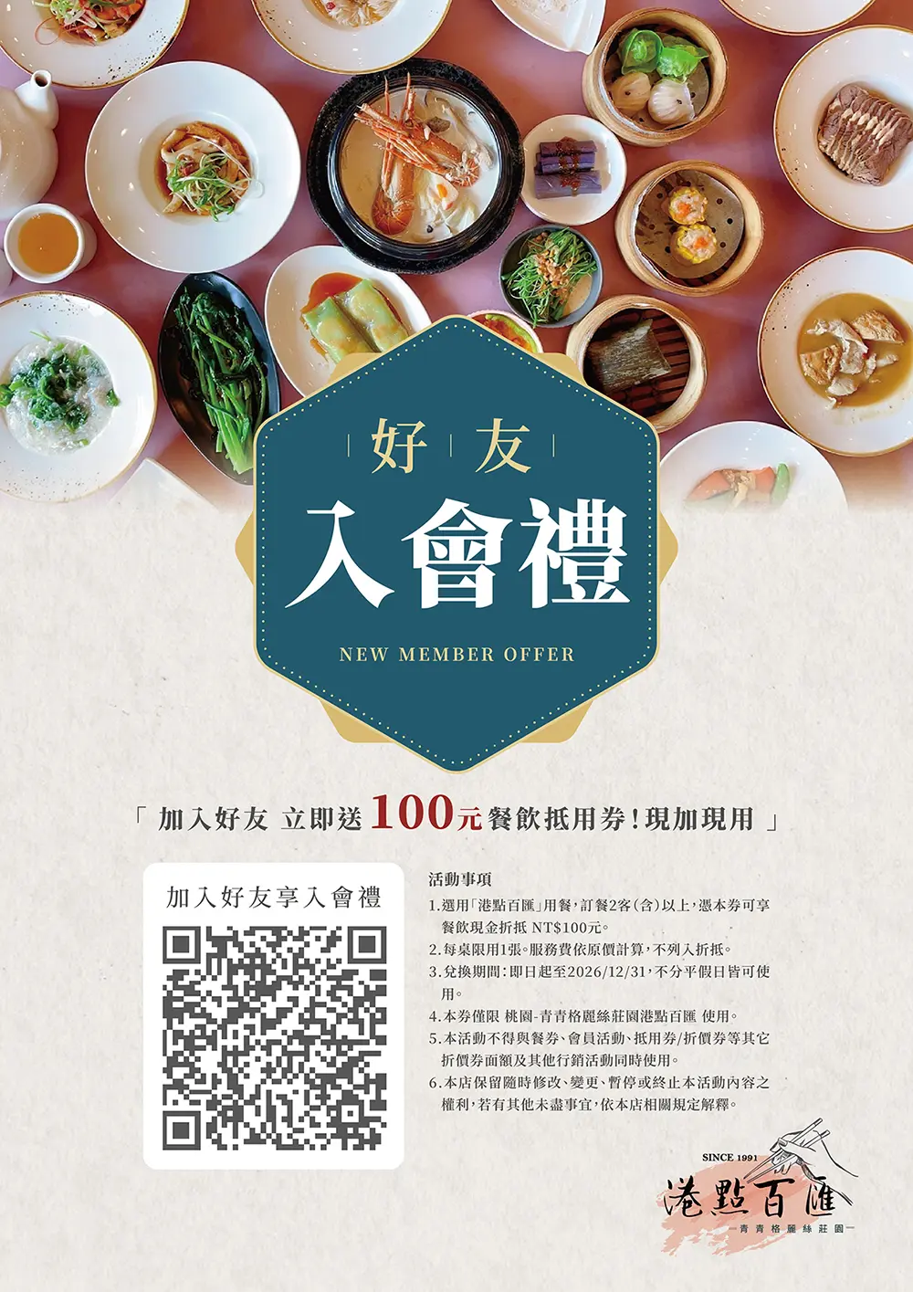 新年度開始,現在加入 青青格麗絲莊園 Line會員, 即可獲得 港點百匯 100 元餐飲抵用券, 現加現用,經典港式美饌歡樂相聚。
